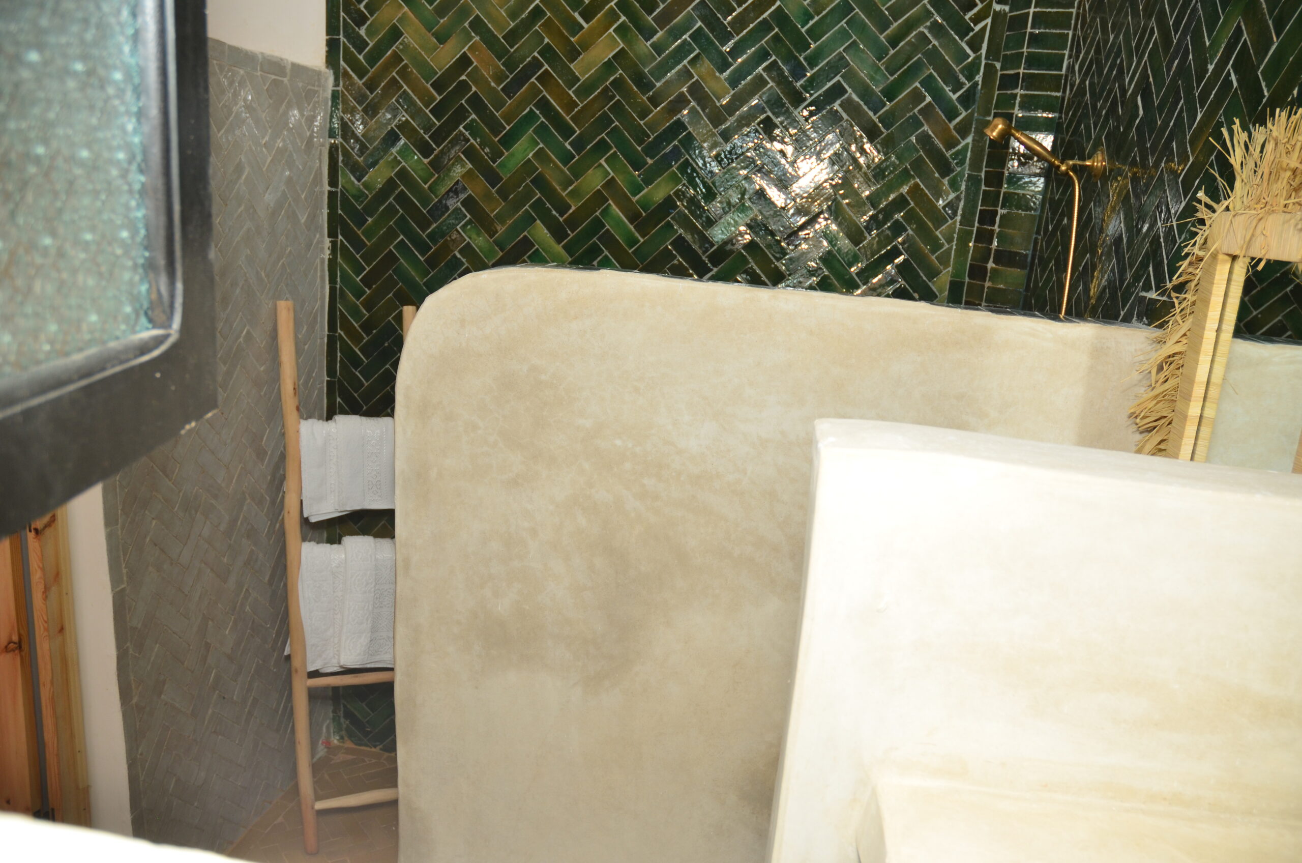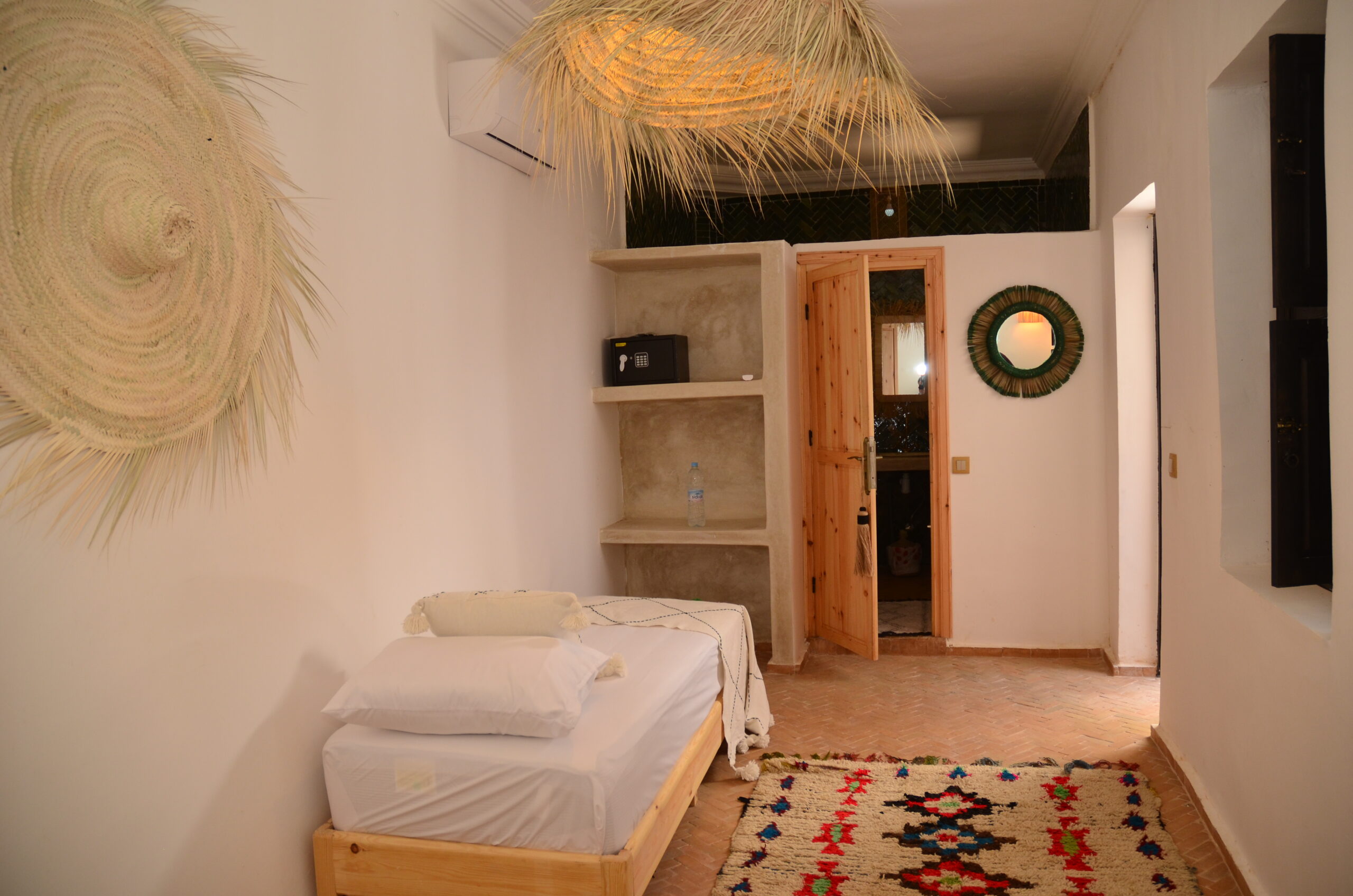 Laissez-vous séduire par la chambre Rihla et ses magnifiques tons vert foncé qui lui confèrent une atmosphère à la fois chic, chaleureuse et apaisante. Située au premier étage du riad, près du balcon intérieur, elle offre un espace généreux pouvant accueillir jusqu’à trois personnes. Que vous voyagiez en petite famille ou entre amis, son élégance naturelle et son confort en font un point de chute idéal pour explorer Marrakech.