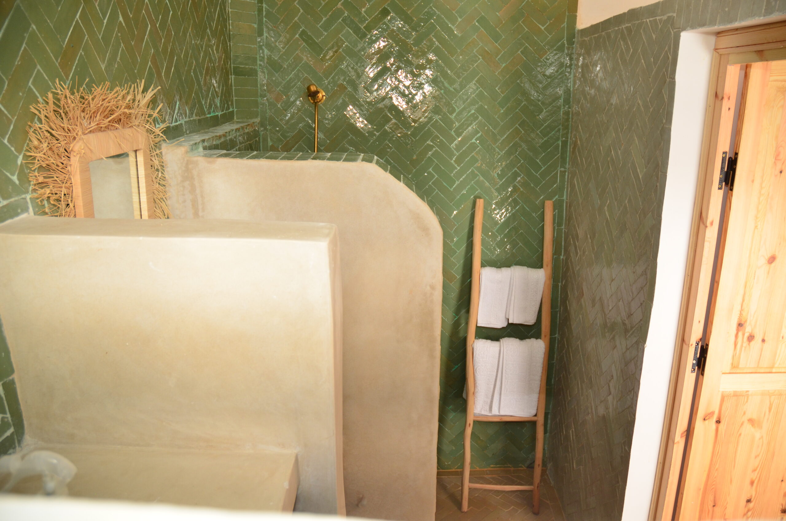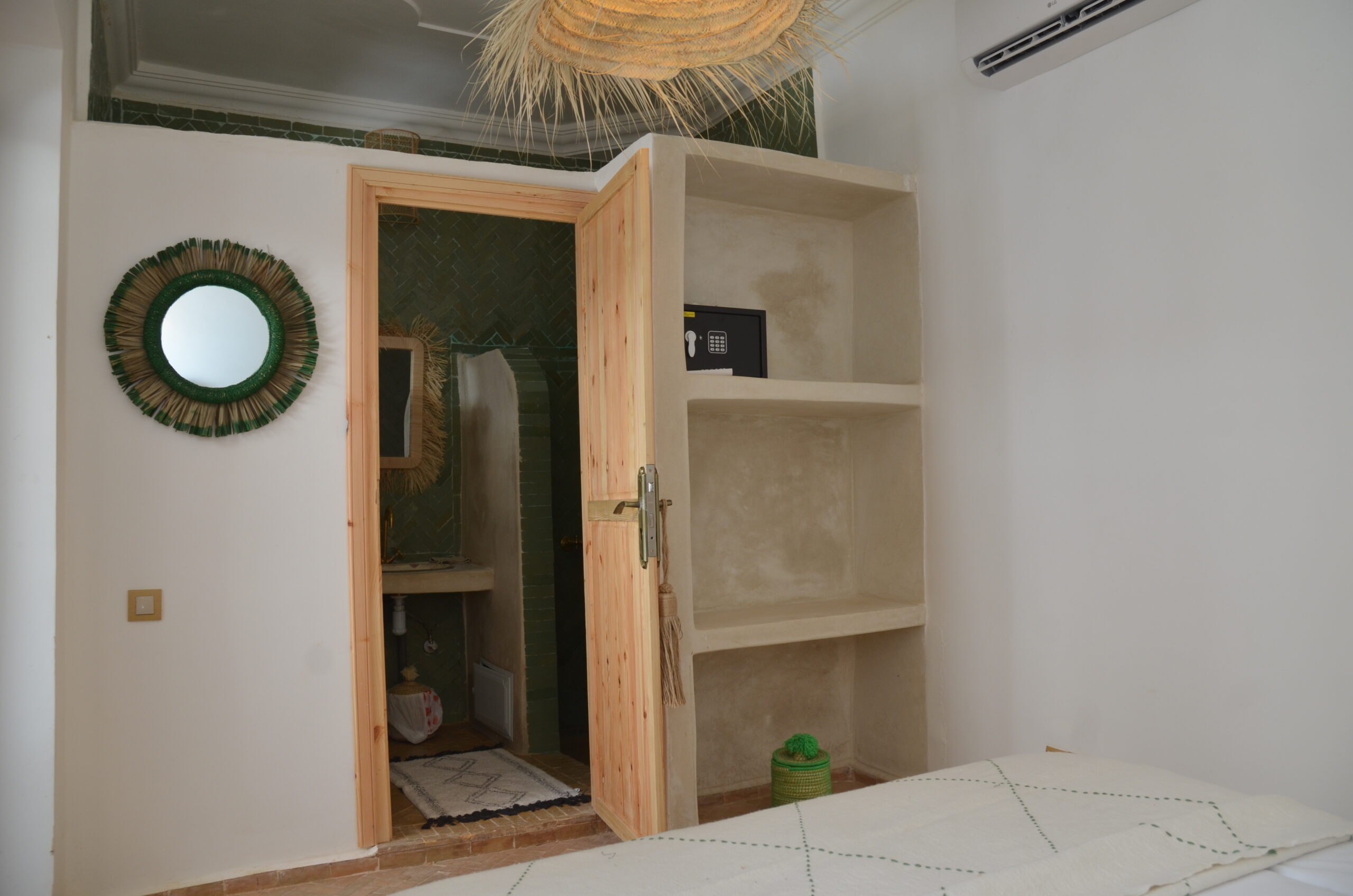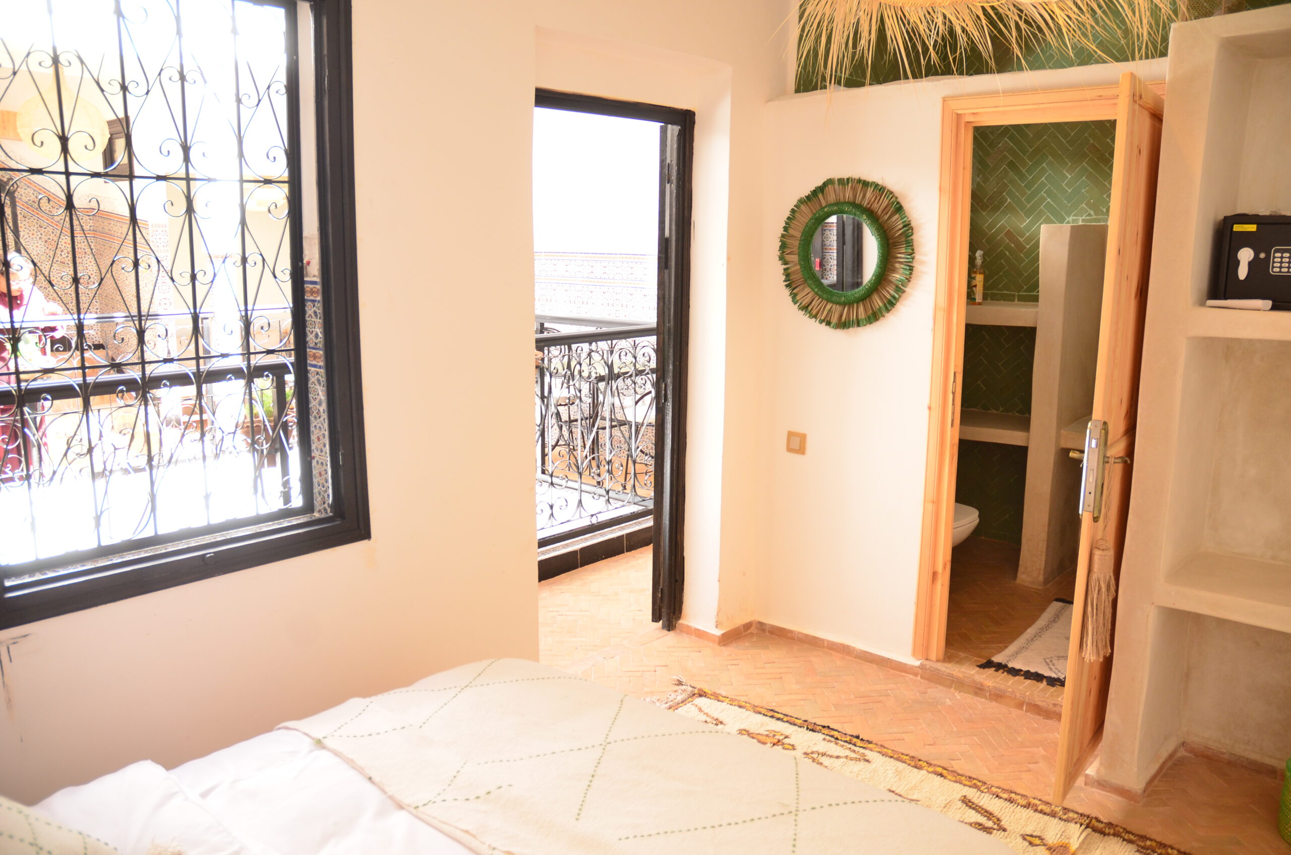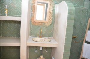 Délicatement décorée avec des touches de vert clair rappelant la nature marocaine, la chambre Sakina vous offre une atmosphère sereine et reposante. Située au premier étage du riad, elle bénéficie d’un emplacement privilégié juste à côté de notre petit salon de détente et de son balcon surplombant le patio. C’est un véritable havre de paix, parfait pour se ressourcer après une journée d’exploration dans l’effervescence de Marrakech.