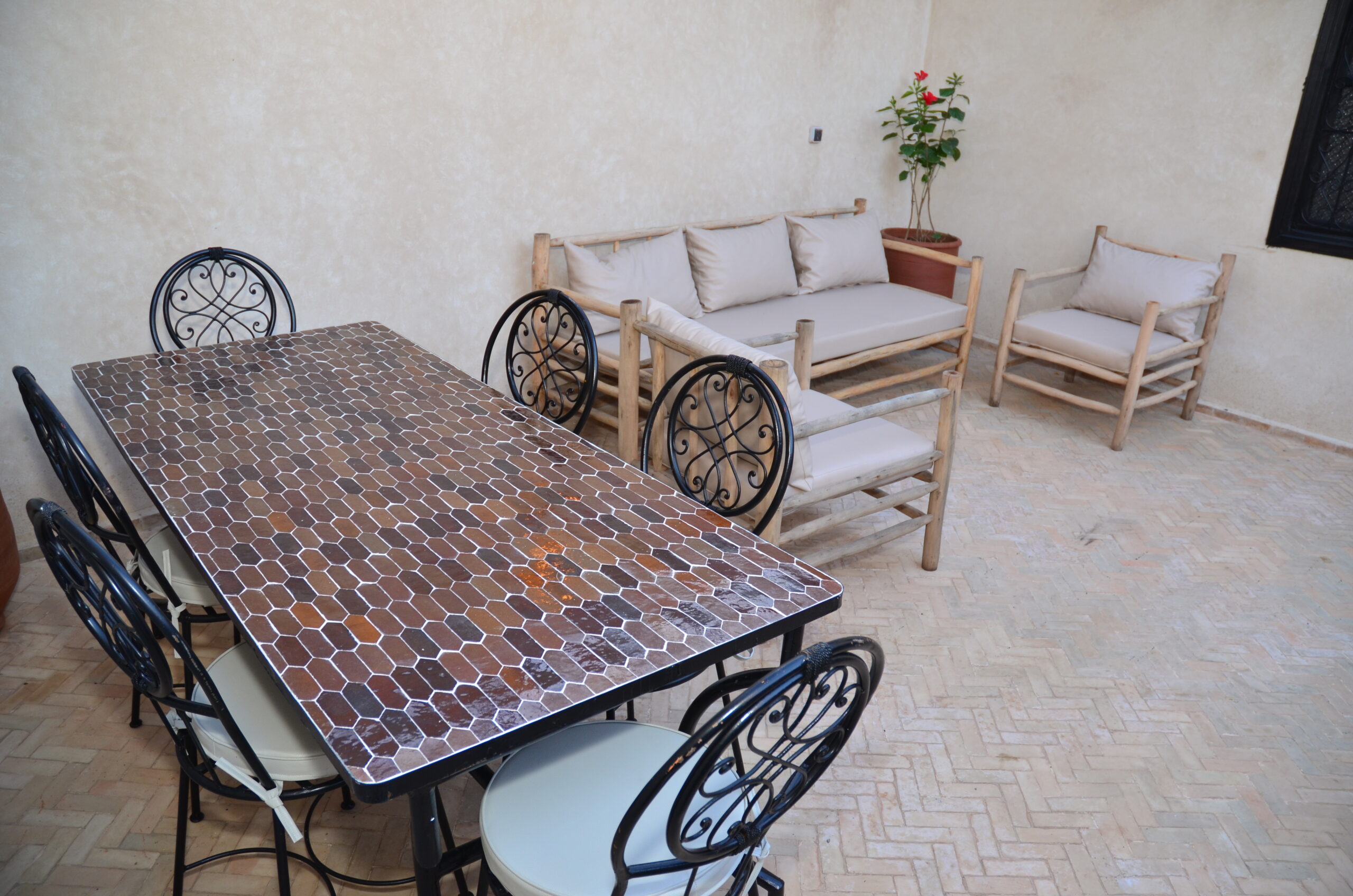 Profitez d’équipements modernes parfaitement intégrés dans ce cadre traditionnel : la chambre est climatisée pour vous garantir une température idéale toute l’année, et dotée d’un coffre-fort pour vos effets personnels ainsi que du Wi-Fi haut débit. Toutes nos chambres sont strictement non-fumeurs et bénéficient d’un service de ménage quotidien. Enfin, savourez chaque matin notre délicieux petit-déjeuner inclus, servi entre 8h et 10h, avant de partir à la découverte de la ville rouge.